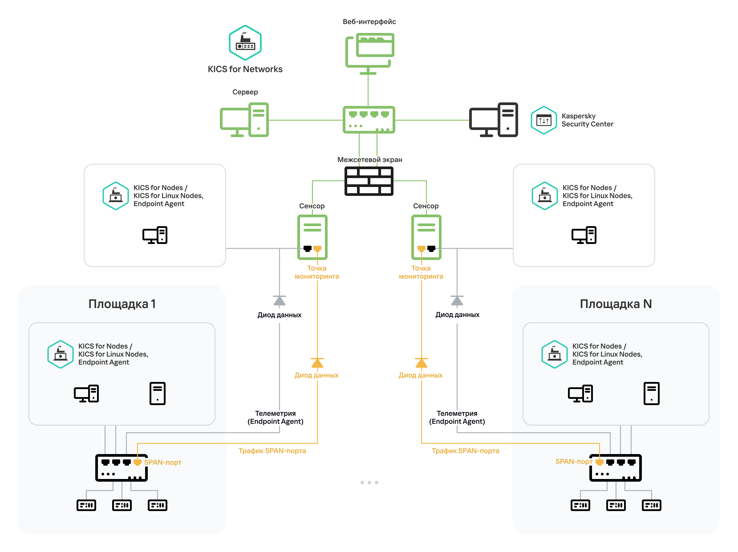 На рисунке ниже показана схема поступления трафика от SPAN-портов сетевых коммутаторов и получения данных телеметрии от EPP-приложения (KICS for Linux Nodes) из нескольких технологических площадок.