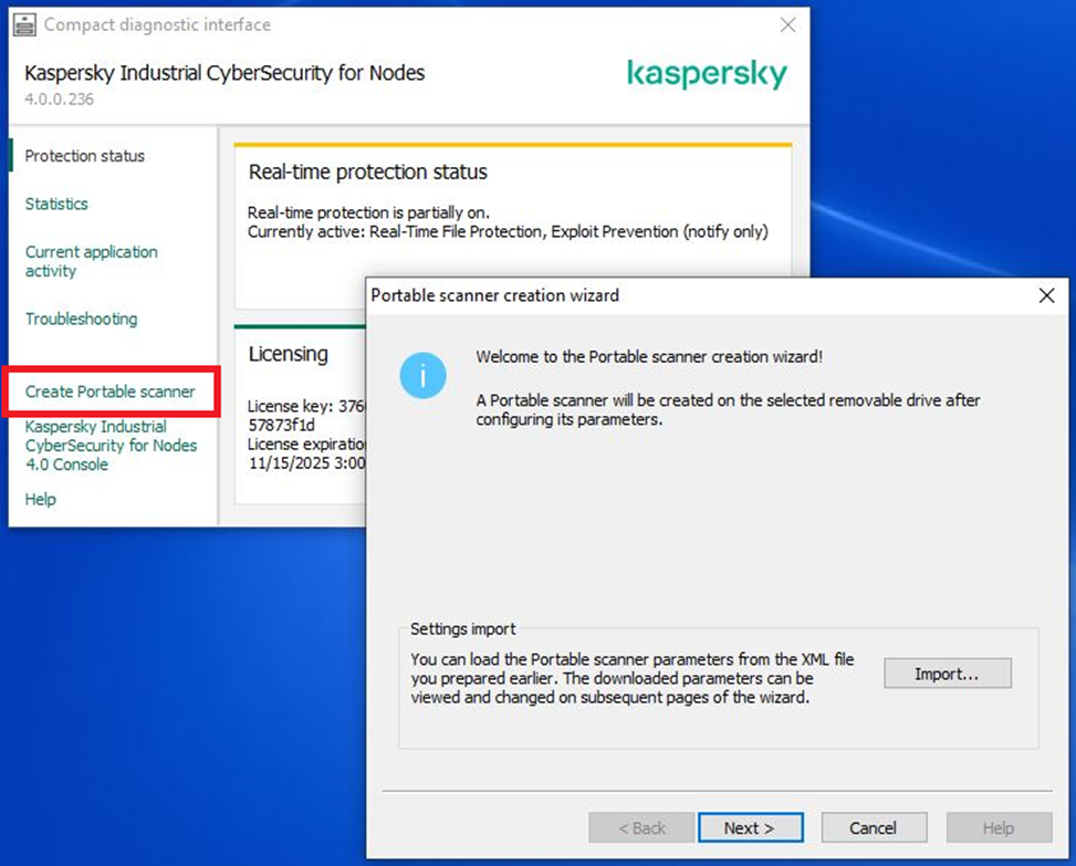 - Действительная лицензия на Kaspersky Industrial CyberSecurity for Nodes Portable Scanner.