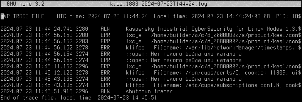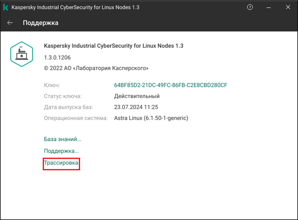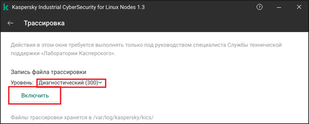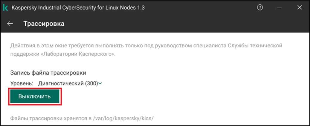 - Созданные файлы трассировки хранятся в директории /var/log/kaspersky/kics/. В файлах трассировки содержится информация об операционной системе, а также могут содержаться персональные данные.