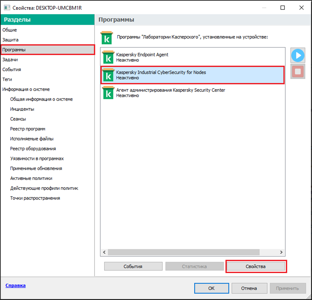 - Выберите раздел "Программы". В рабочей области окна отобразится список программ "Лаборатории Касперского", установленных на устройстве. Нажмите на Kaspersky Industrial CyberSecurity for Nodes, затем нажмите на кнопку "Свойства"