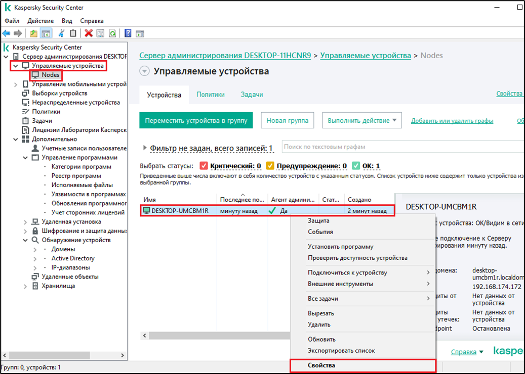 В папке «Управляемые устройства» дерева Консоли администрирования откройте папку с названием группы администрирования, в состав которой входит нужное вам устройство.