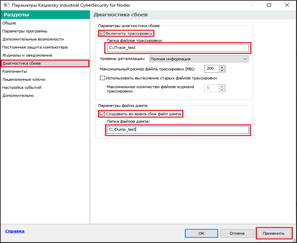 - Kaspersky Industrial CyberSecurity for Nodes не создает папку для сохранения файлов трассировки или файлов дампа на устройстве автоматически. Необходимо заранее создать папки и указать путь к ним.